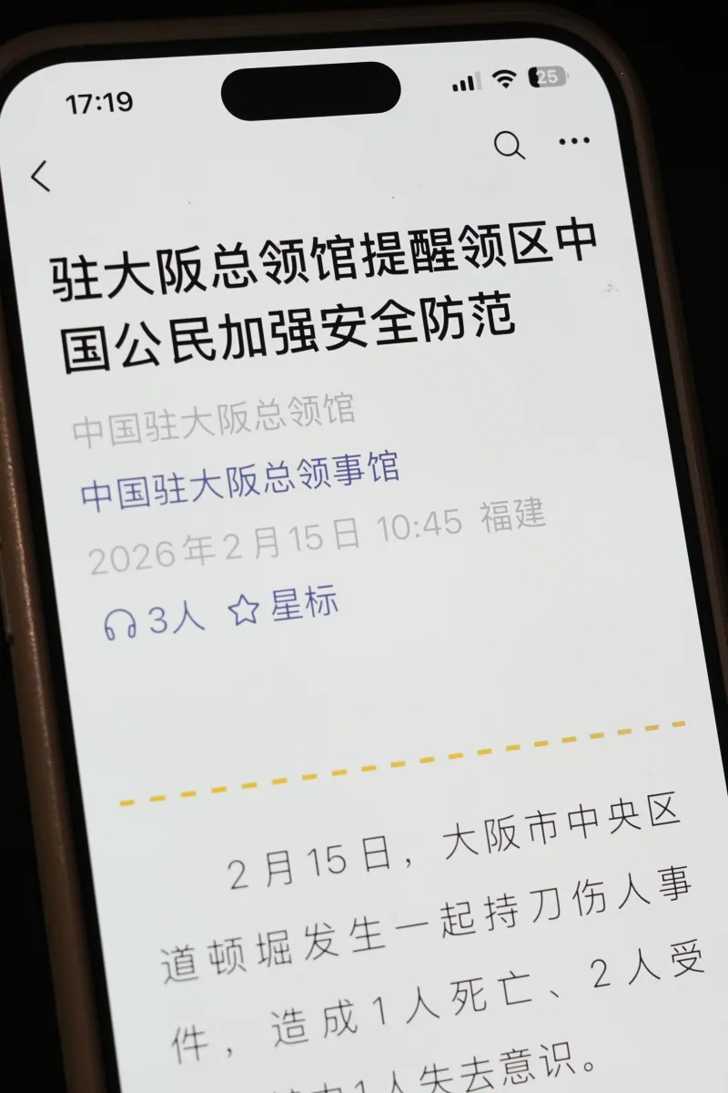 【北京共同】在大阪中国総領事館は15日、大阪市の繁華街・道頓堀で起きた殺傷事件を受け、中国国民に改めて日本への渡航を自粛するよう通信アプリ、微信(ウィーチャット)の公式アカウントで呼びかけた…。。❗️